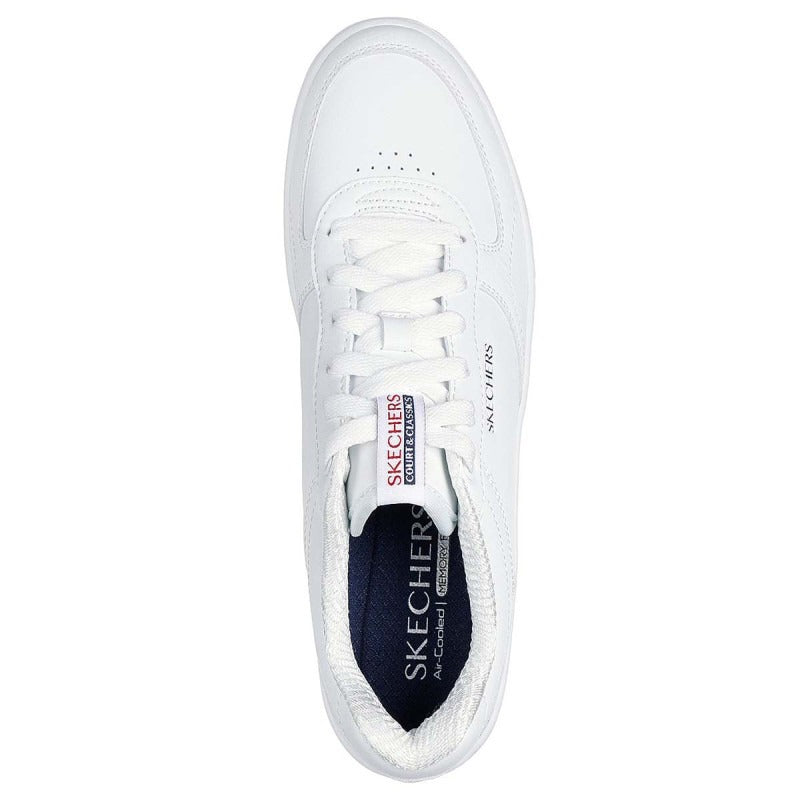 Casual modern style and comfort combine in Skechers Sport Court 2.0 - Core Essential. Featuring a sleek court silhouette, lace-up duraleather upper and a cushioned Skechers Air-Cooled Memory Foam® insole.